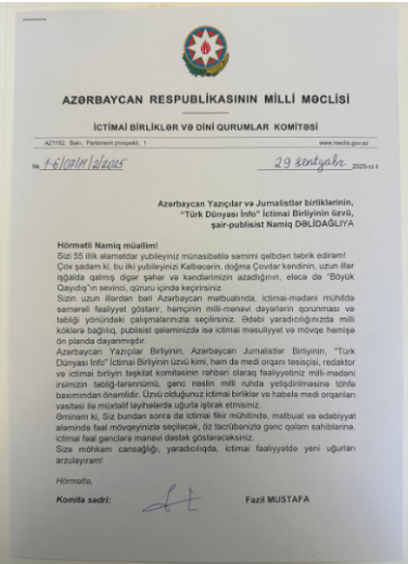 Milli Məclisin İctimai birliklər və dini qurumlar komitəsinin sədri Fazil Mustafa Azərbaycan Yazıçılar və Jurnalistlər birliklərinin, “Türk Dünyası İnfo” İctimai Birliyinin üzvü, şair-publisist Namiq Dəlidağlını 55 illik yubileyi ilə bağlı təbrik edib.